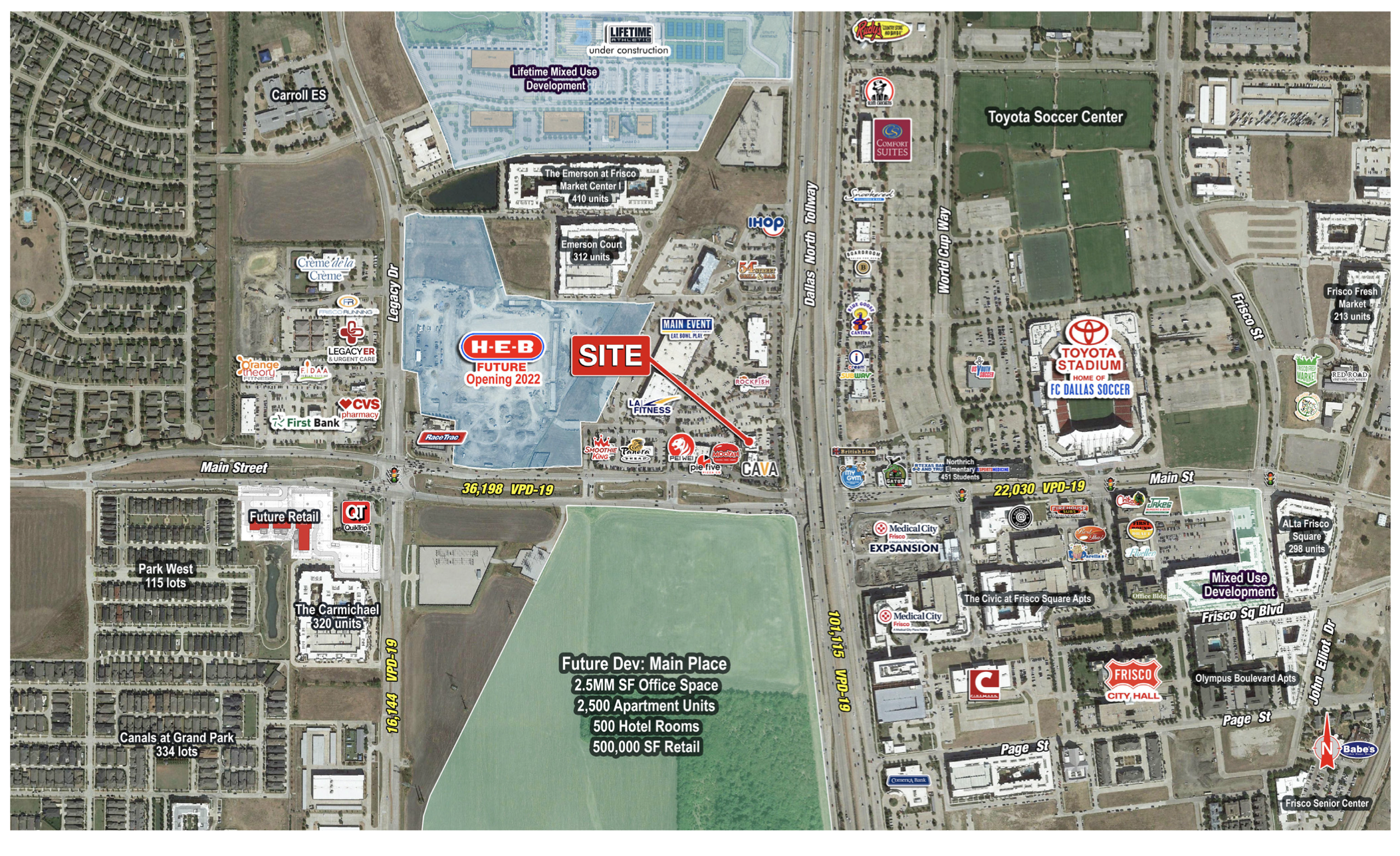 Frisco Market Center is a newly constructed three-building retail center shadow anchored by H-E-B Frisco, LA Fitness, Life Time Fitness, and Main Event Entertainment in Frisco, Texas, opposite the Toyota Stadium. As part of the 88-acre master planned Frisco Market Center development, the property sits on over 4 acres of land approximately thirty minutes north of downtown Dallas and 4 miles north of the Dallas Cowboy’s World Headquarters at The Star. Additionally, the property is 2.1 miles from the newly announced Universal Studios Parks & Resorts 97 acre theme park in Frisco and 13 minutes south of the new PGA of America Frisco Headquarters.
